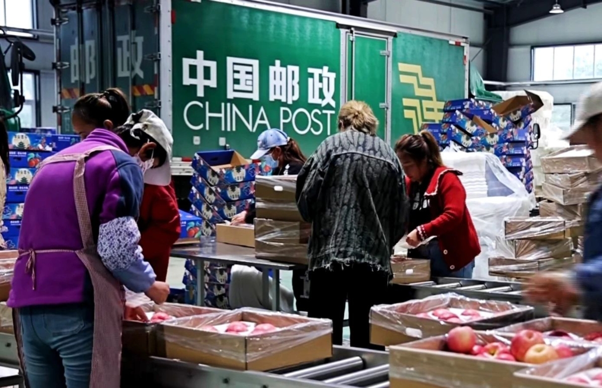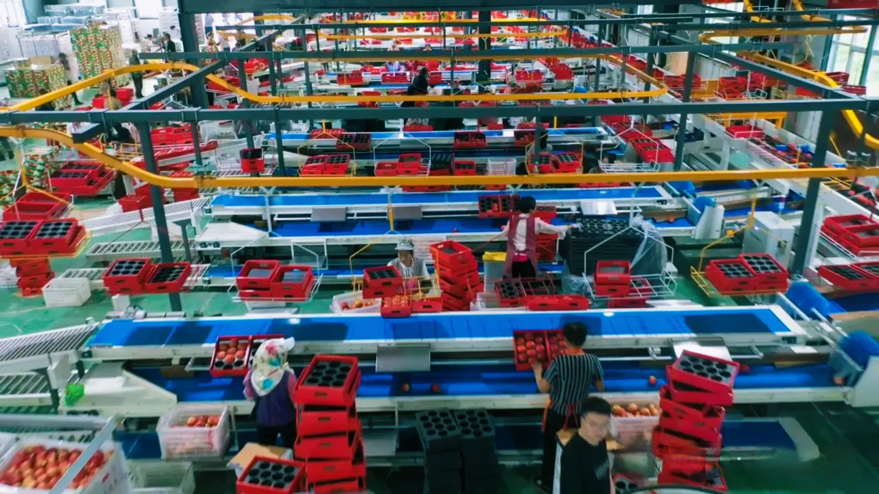 一个个红彤彤、黄澄澄的苹果通过圆形硅胶托盘运上流水线,经过检测通道,按照重量、果型、甜度等被分成了数个等级,最终流转到不同端口进行分拣、装箱,平均每小时分选2吨苹果。眼下正值苹果销售旺季,几十名工人有条不紊地在分选线上忙碌着装箱、打包、搬运,一箱箱优质苹果将被运送到全国各地进行销售。