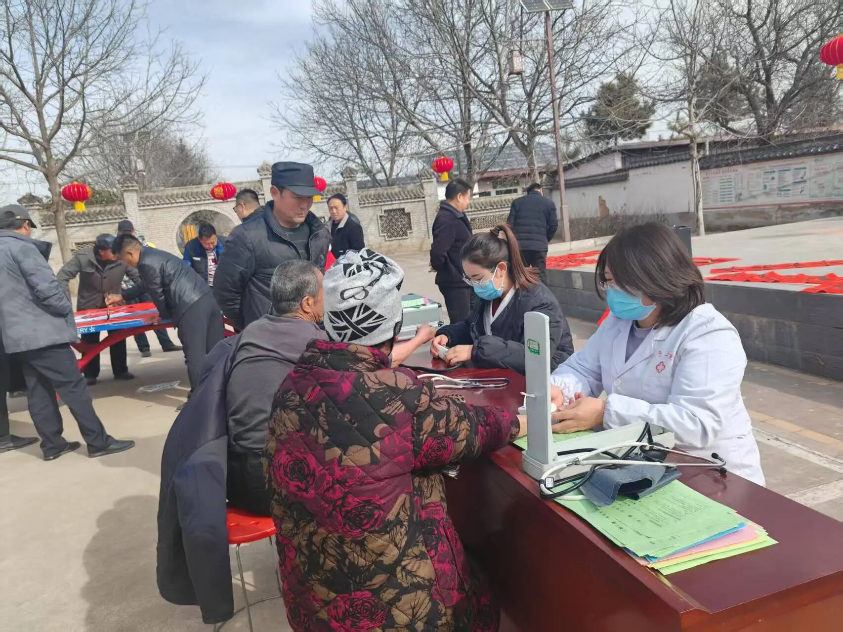 另一边的义诊区同样热闹非凡。镇卫生院的医护人员与村医组成服务小队,为中老年人免费提供血压测量、血糖检测、中医问诊等服务,重点针对高血压、糖尿病等老年常见病,耐心讲解日常用药、冬季养生和跌倒预防等实用知识。对行动不便的高龄老人,医护人员还开辟“绿色通道”,提供专人陪同、入户诊疗服务,将健康关怀送到家中。“您的血压有点偏高,春节期间要少吃油腻,按时吃药,记得定期复测。”医护人员一边为老人检查,一边叮嘱注意事项,同时发放健康宣传手册,把专业的健康指导送到群众心坎上。