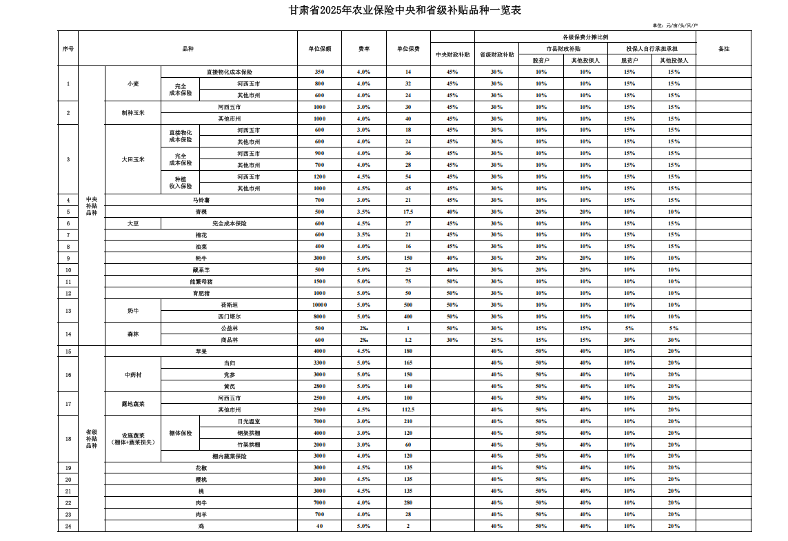 一图读懂甘肃省2025年农业保险中央和省级补贴品种的详细情况