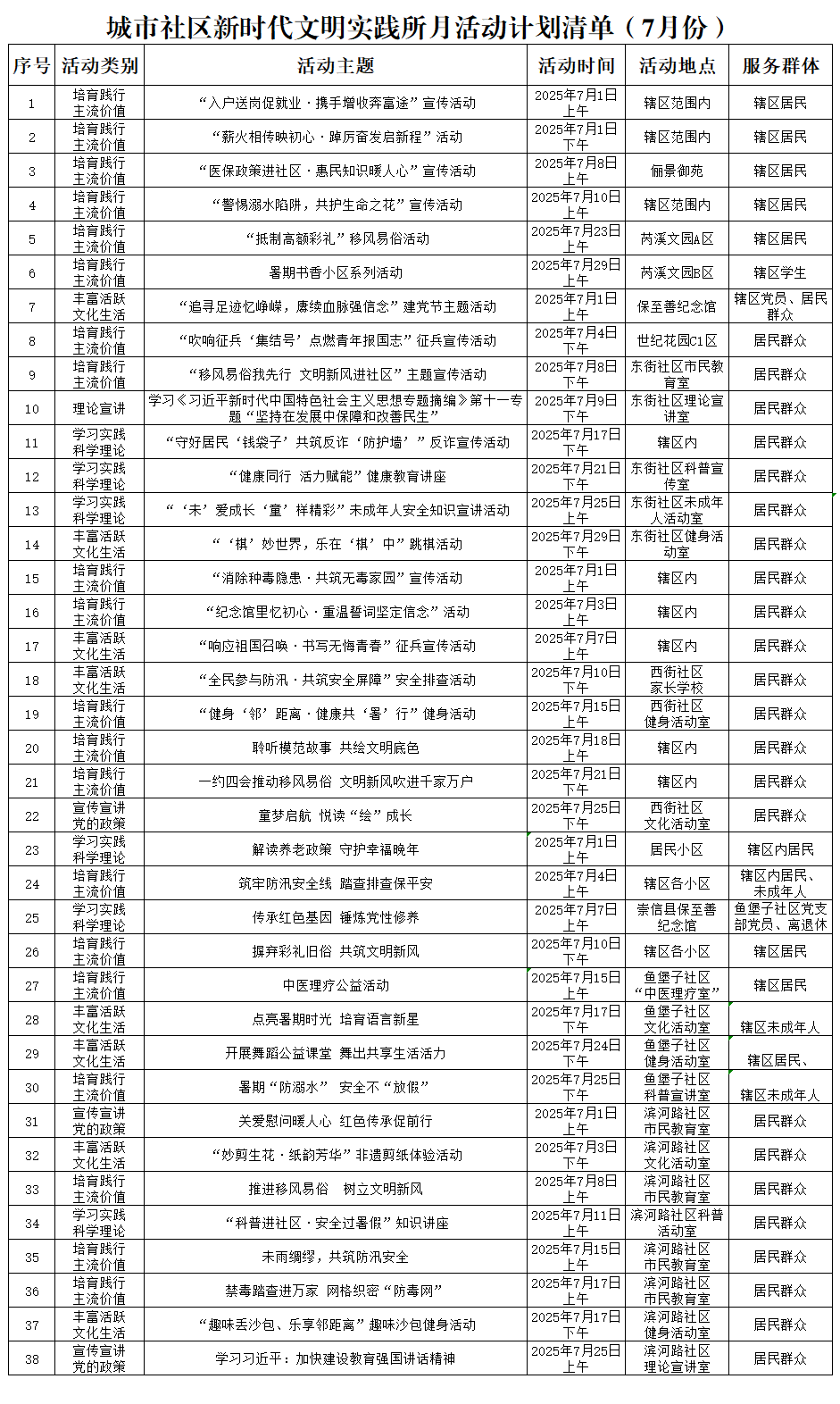 城市社区新时代文明实践所月活动计划清单(7月份) 发文日期:2025-07-04 10:33 来源:崇信县城市社区 作者:王红艳 编辑:王红艳 扫一扫在手机打开当前页 上一篇: 城市社区新时代文明实践所月活动计划清单(8月份) 下一篇: 城市社区新时代文明实践所月活动计划清单(6月份)