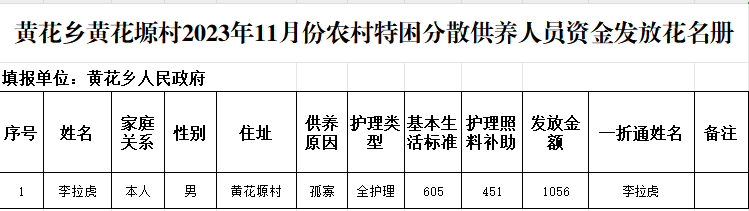 黄花乡黄花塬村2023年11月份农村特困分散供养人员资金发放花名册 发文日期:2023-11-15 11:41 来源:崇信县黄花乡 作者:梁俊龙 编辑:梁俊龙 扫一扫在手机打开当前页 上一篇: 黄花乡凉水泉村2023年11月份农村特困分散供养人员资金发放花名册 下一篇: 黄花乡高年村2023年11月份农村特困分散供养人员资金发放花名册