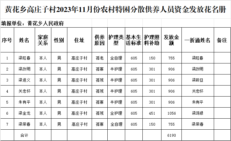 黄花乡高庄子村2023年11月份农村特困分散供养人员资金发放花名册 发文日期:2023-11-15 11:29 来源:崇信县黄花乡 作者:梁俊龙 编辑:梁俊龙 扫一扫在手机打开当前页 上一篇: 黄花乡高年村2023年11月份农村特困分散供养人员资金发放花名册 下一篇: 黄花乡杨家沟村2023年10月份农村特困分散供养人员资金发放花名册