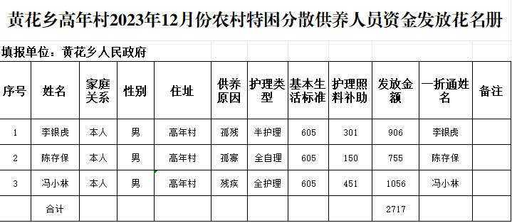 黄花乡高年村2023年12月份农村特困分散供养人员资金发放花名册 发文日期:2023-12-15 11:52 来源:崇信县黄花乡 作者:梁俊龙 编辑:梁俊龙 扫一扫在手机打开当前页 上一篇: 黄花乡高庄子村2023年12月份农村特困分散供养人员资金发放花名册 下一篇: 黄花乡杨家沟村2023年11月份农村特困分散供养人员资金发放花名册