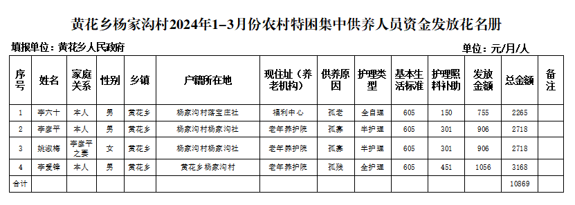 黄花乡杨家沟村2024年1-3月份农村特困集中供养人员资金发放花名册 发文日期:2024-03-04 16:03 来源:崇信县黄花乡 作者:梁俊龙 编辑:梁俊龙 扫一扫在手机打开当前页 上一篇: 黄花乡黄花塬村2024年1-3月份农村特困集中供养人员资金发放花名册 下一篇: 黄花乡水磨村2024年1-3月份农村特困集中供养人员资金发放花名册