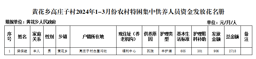 黄花乡高庄子村2024年1-3月份农村特困集中供养人员资金发放花名册 发文日期:2024-03-04 15:59 来源:崇信县黄花乡 作者:梁俊龙 编辑:梁俊龙 扫一扫在手机打开当前页 上一篇: 黄花乡水磨村2024年1-3月份农村特困集中供养人员资金发放花名册 下一篇: 黄花乡杨家沟村2024年1-3月份农村特困分散供养人员资金发放花名册