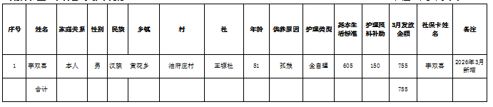 2026年3月份农村特困分散供养人员资金发放花名册 发文日期:2026-03-05 14:50 来源:崇信县黄花乡 作者:梁俊龙 编辑:梁俊龙 扫一扫在手机打开当前页 下一篇: 2026年1-3月份农村特困分散供养人员资金发放花名册