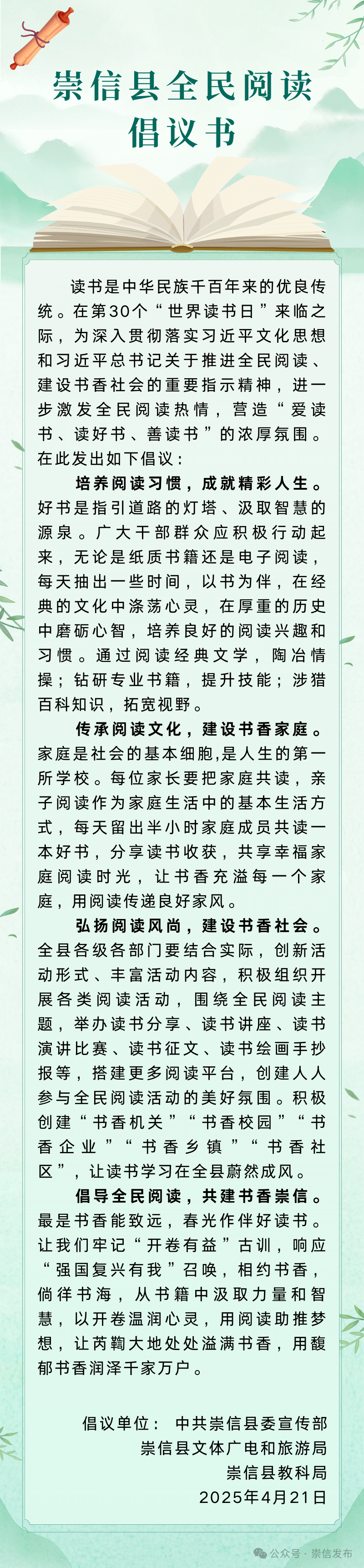 崇信县全民阅读倡议书 发文日期:2025-03-22 15:43 来源:崇信县黄花乡 作者:梁俊龙 编辑:梁俊龙 扫一扫在手机打开当前页 上一篇: 家门口的“幸福餐桌”暖人心 下一篇: 弘扬丧事简办文明新风倡议书