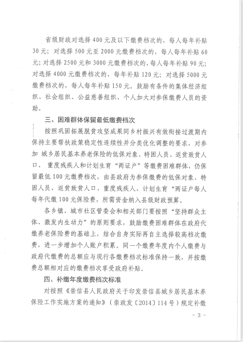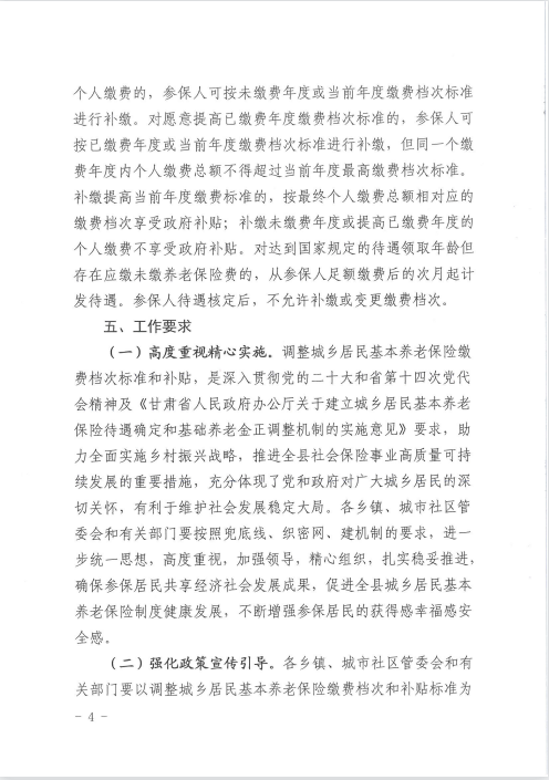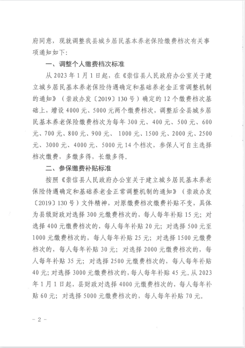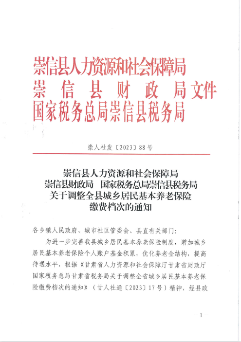 关于调整全县城乡居民基本养老保险缴费档次的通知 发文日期:2023-04-03 16:50 来源:崇信县黄花乡 作者:黄花乡人民政府 编辑:梁俊龙 扫一扫在手机打开当前页 上一篇: 甘肃省农村最低生活保障家庭经济状况评估认定办法 下一篇: 关于提高2023年城乡低保和特困人员救助供养标准工作的通知