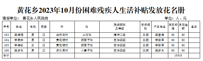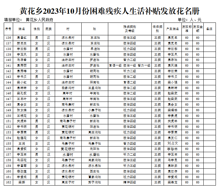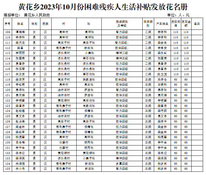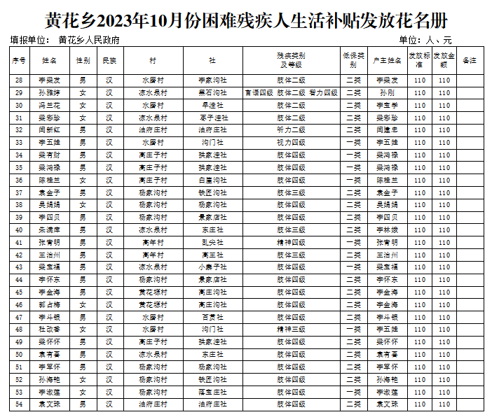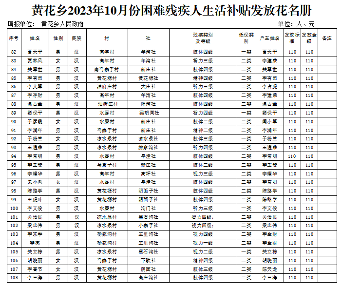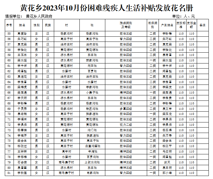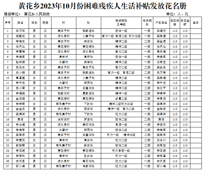 黄花乡2023年10月份困难残疾人生活补贴发放花名册 发文日期:2023-10-09 11:51 来源:崇信县黄花乡 作者:梁俊龙 编辑:梁俊龙 扫一扫在手机打开当前页 上一篇: 黄花乡2023年11月份事实无人抚养儿童生活补助发放花名册 下一篇: 黄花乡2023年10月份事实无人抚养儿童生活补助发放花名册