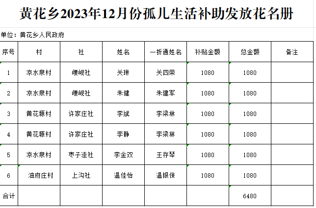 黄花乡2023年12月份孤儿生活补助发放花名册 发文日期:2023-12-15 11:02 来源:崇信县黄花乡 作者:梁俊龙 编辑:梁俊龙 扫一扫在手机打开当前页 上一篇: 黄花乡2023年12月份事实无人抚养儿童生活补助发放花名册 下一篇: 黄花乡11月份经济困难老年人护理补贴发放对象花名册