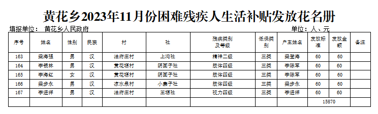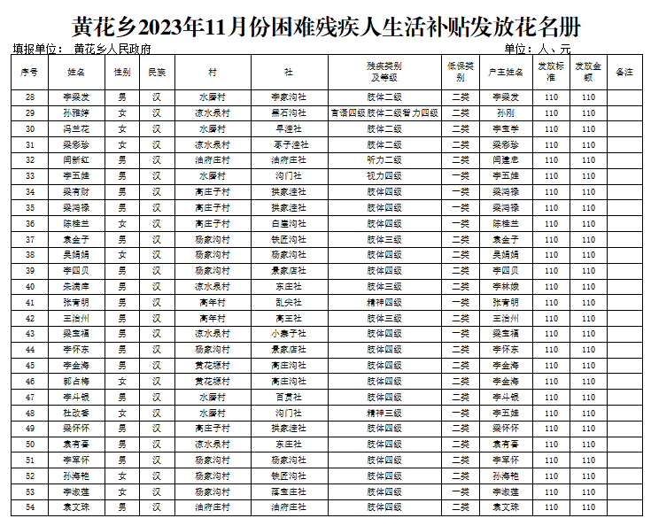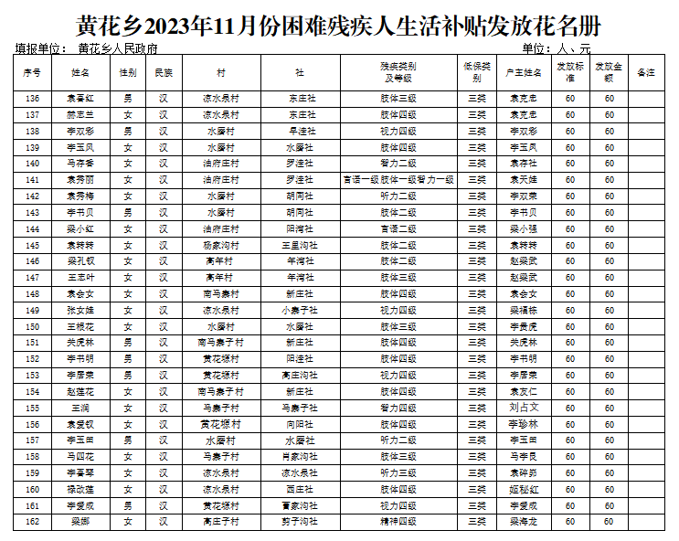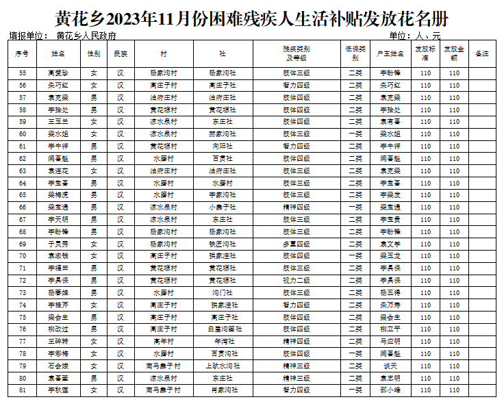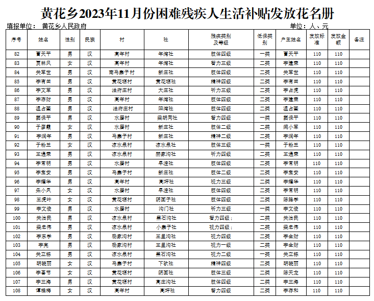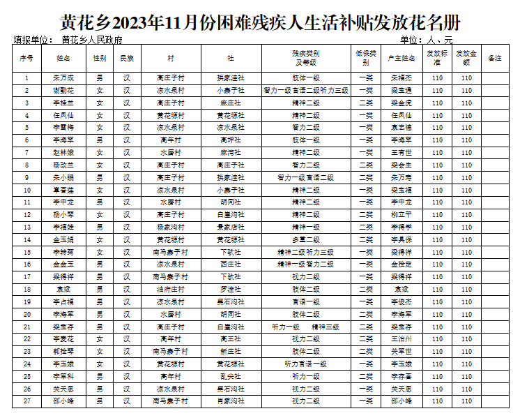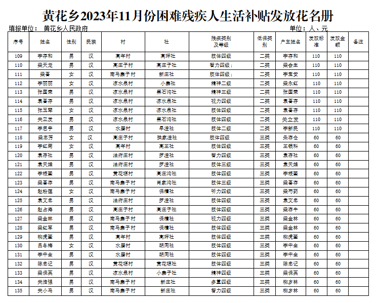 黄花乡2023年11月份困难残疾人生活补贴发放花名册 发文日期:2023-11-09 10:49 来源:崇信县黄花乡 作者:梁俊龙 编辑:梁俊龙 扫一扫在手机打开当前页 上一篇: 黄花乡11月份经济困难老年人护理补贴发放对象花名册 下一篇: 黄花乡2023年11月份孤儿生活补助发放花名册