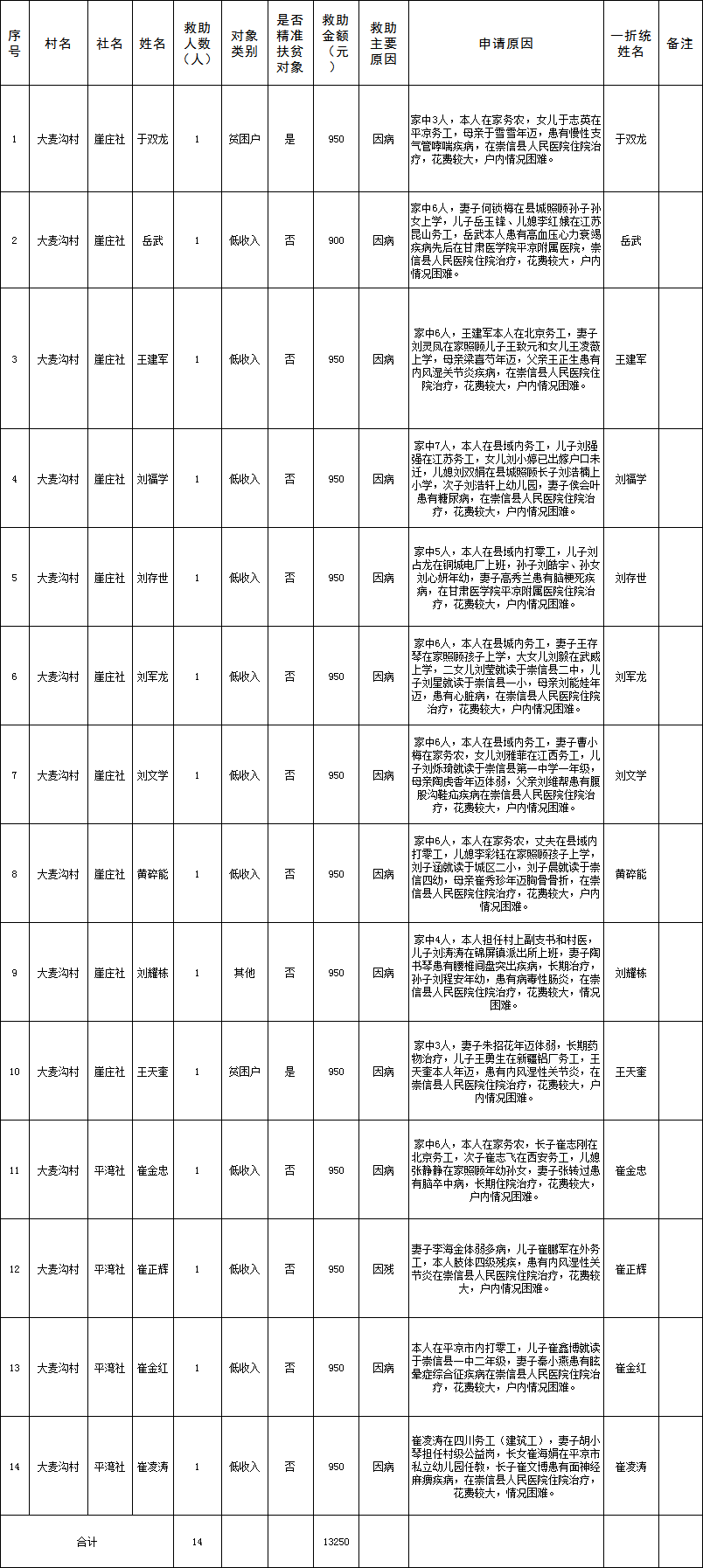 大麦沟村2023年11月份小额临时救助花名册 发文日期:2023-12-12 15:12 来源:崇信县黄寨镇 作者:赵璐 编辑:赵璐 扫一扫在手机打开当前页 上一篇: 张明洼村2023年11月低保花名册、汇总表、变更表 下一篇: 黄土村2023年10月份小额临时救助花名册