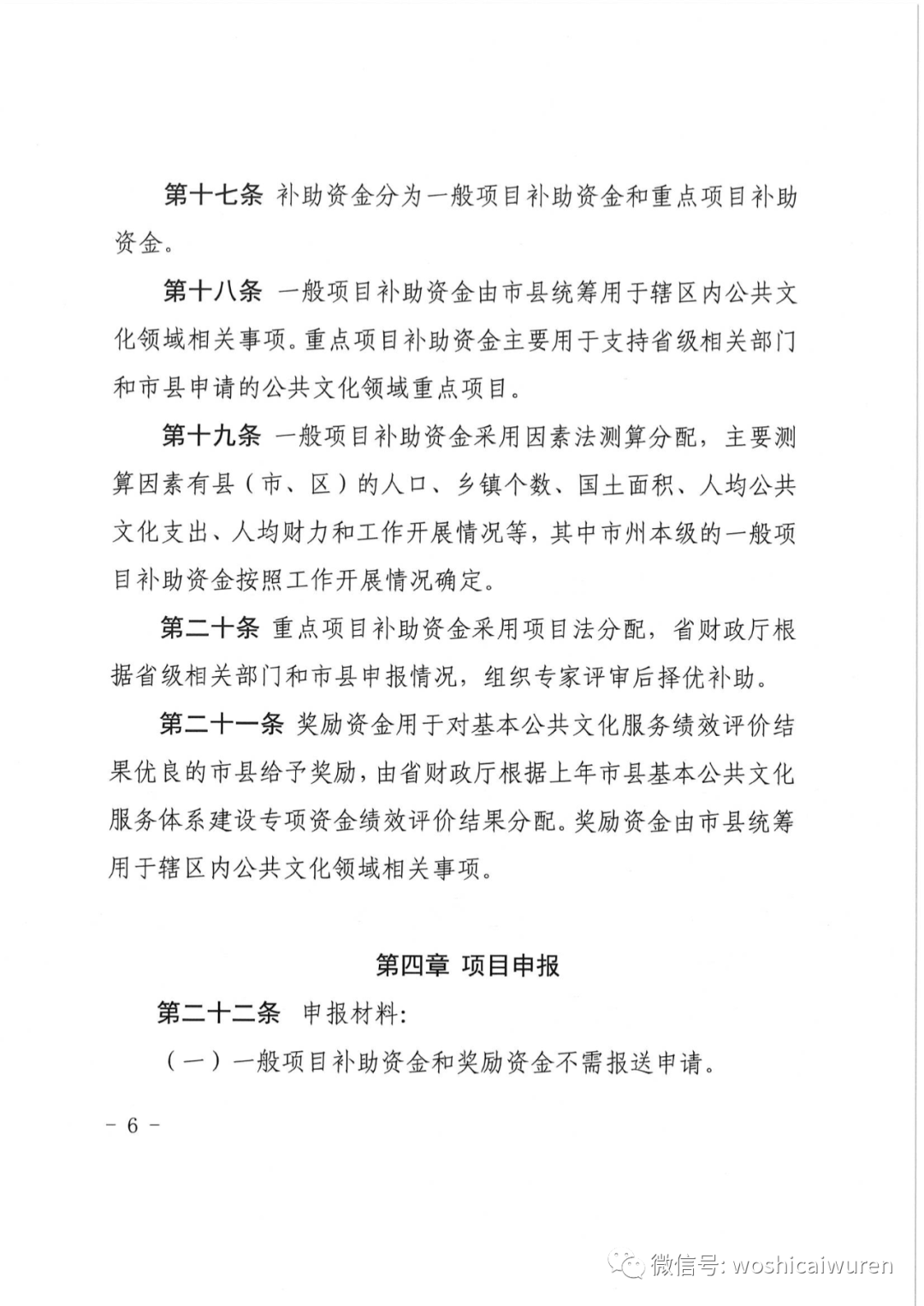 第十九条 一般项目补助资金采用因素法测算分配,主要测算因素有县(市、区)的人口、乡镇个数、国土面积、人均公共文化支出、人均财力和工作开展情况等,其中市州本级的一般项目补助资金按照工作开展情况确定。