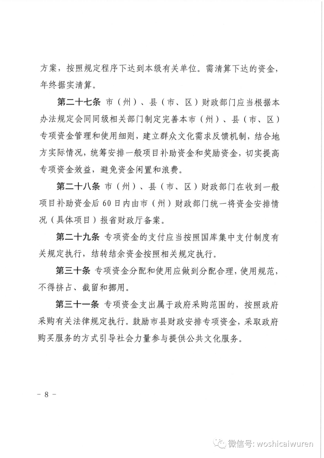 第三十一条 专项资金支出属于政府采购范围的,按照政府采购有关法律规定执行。鼓励市县财政安排专项资金,采取政府购买服务的方式引导社会力量参与提供公共文化服务。