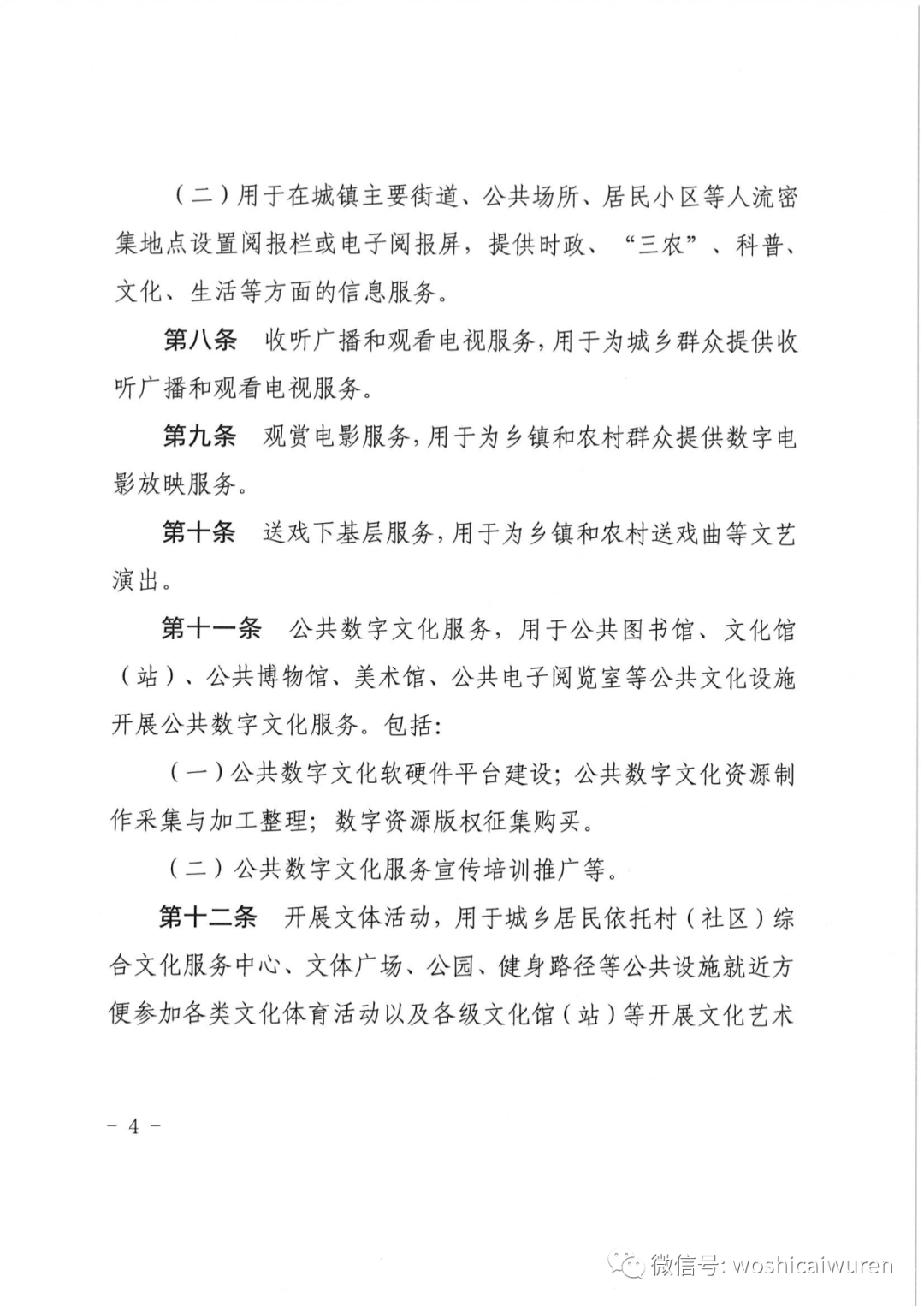 第七条 读书看报服务:(一)用于公共图书馆、文化馆(中心)、乡镇和村(社区)基层综合文化服务中心(含农家书屋)等配备图书、报刊和电子书刊,并免费提供借阅服务。(二)用于在城镇主要街道、公共场所、居民小区等人流密集地点设置阅报栏或电子阅报屏,提供时政、“三农”、科普、文化、生活等方面的信息服务。