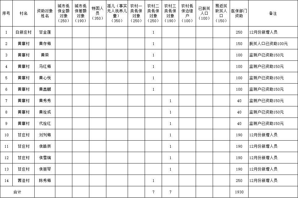 黄寨镇12月份新增低保户等特殊人群医保资助发钱花名册 发文日期:2023-12-12 15:10 来源:崇信县黄寨镇 作者:赵璐 编辑:赵璐 扫一扫在手机打开当前页 上一篇: 黄寨2023年12月份低保花名册、汇总表、变更表 下一篇: 10月份孤儿基本生活费