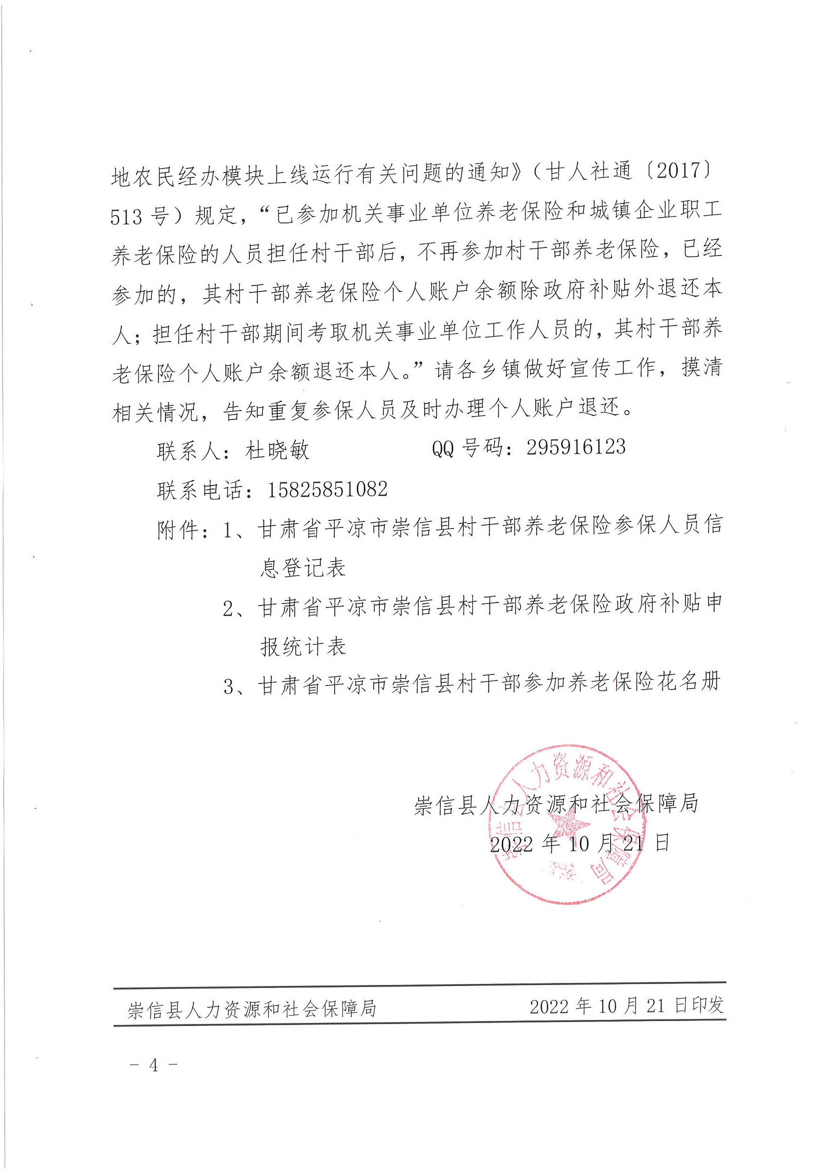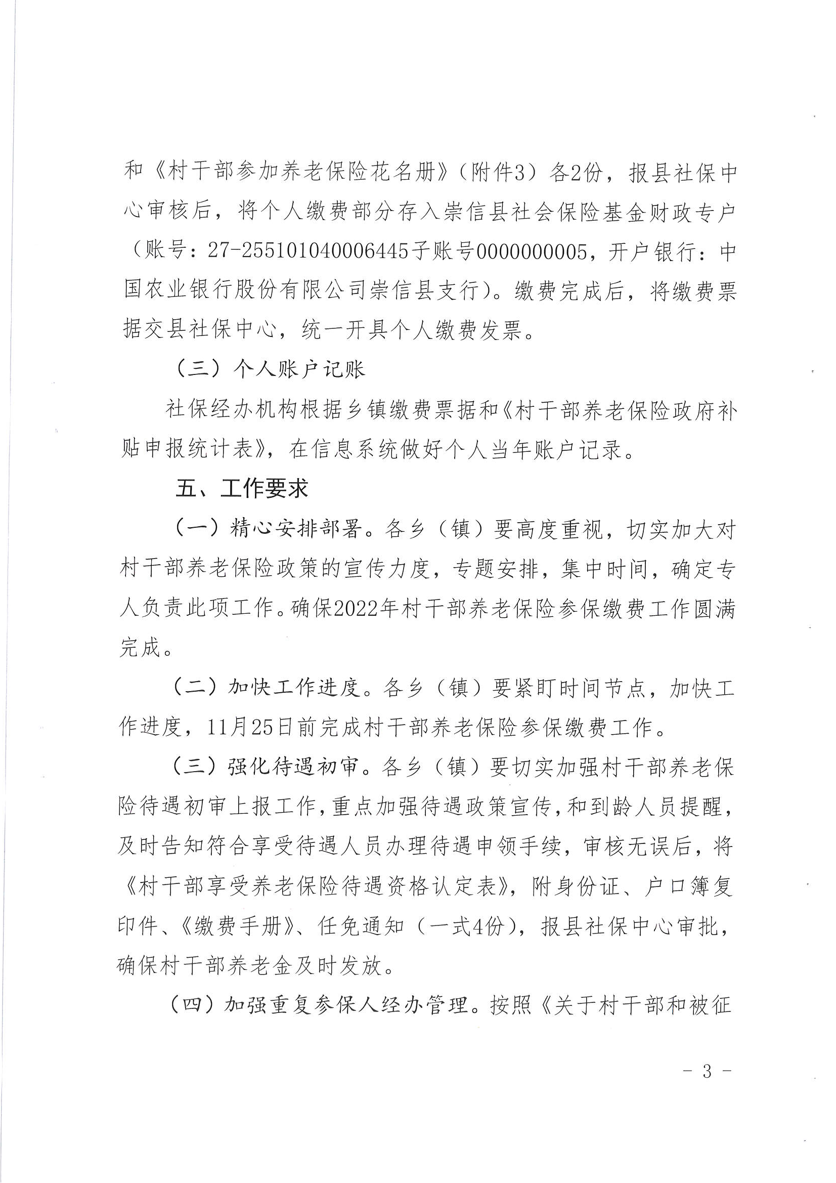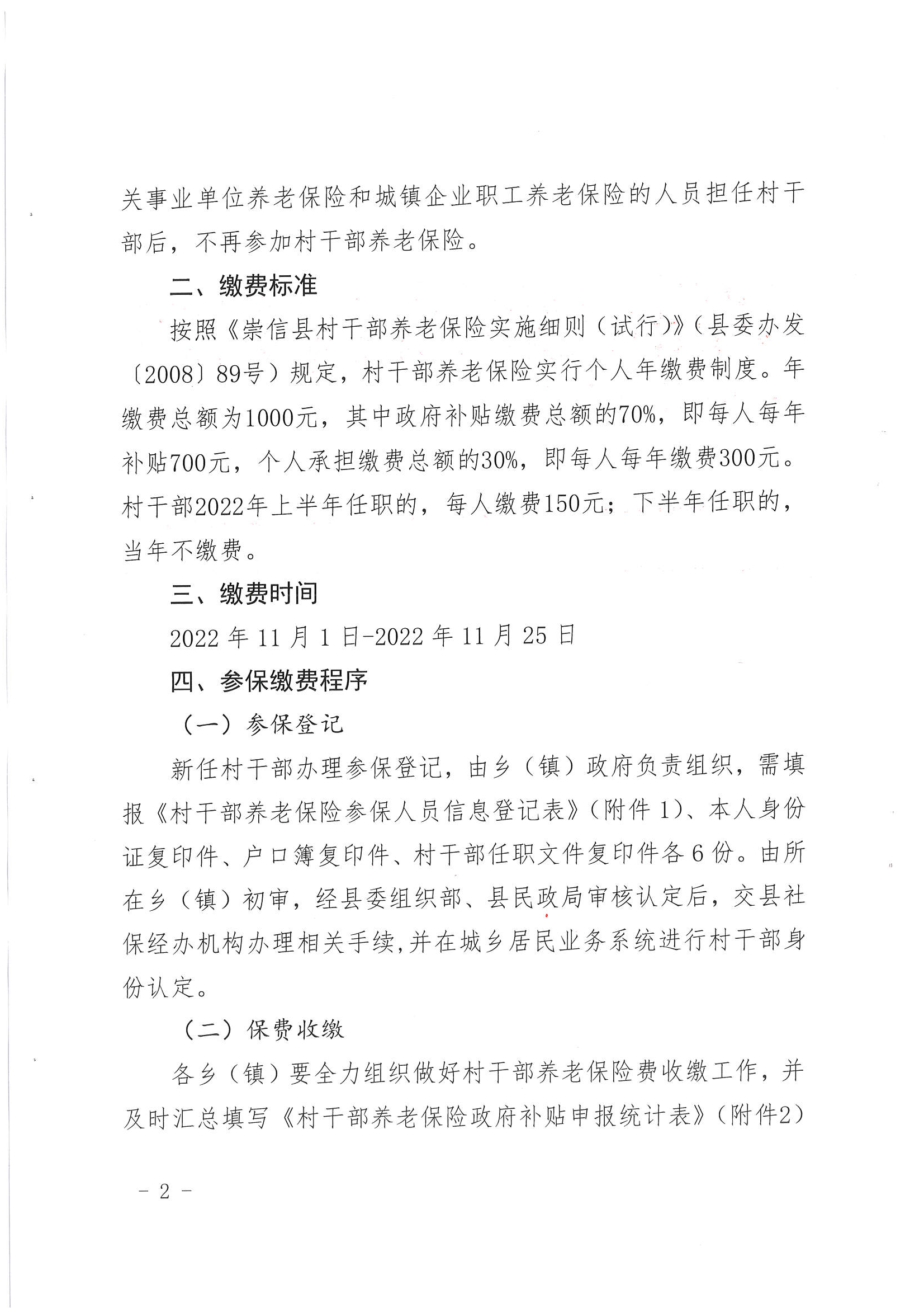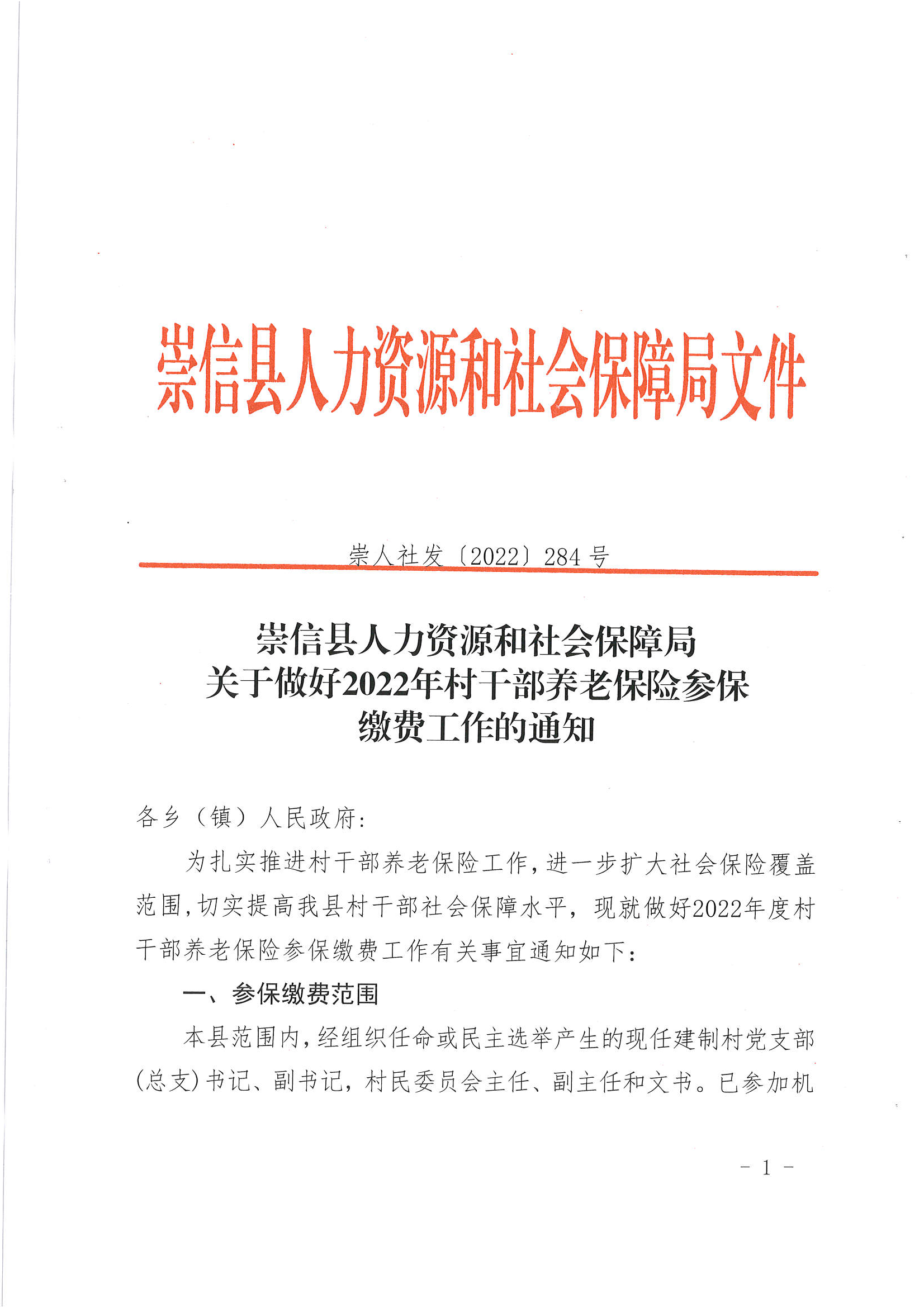 关于做好2022年村干部养老保险参保缴费工作的通知 发文日期:2022-11-02 10:19 来源:崇信县锦屏镇 作者:崇信县锦屏镇 编辑:秦雅芸 扫一扫在手机打开当前页 上一篇: 关于持续做好城乡居民养老保险待遇领取资格认证工作的通知 下一篇: 崇信县2023年度城乡居民基本医疗保险参保缴费公告
