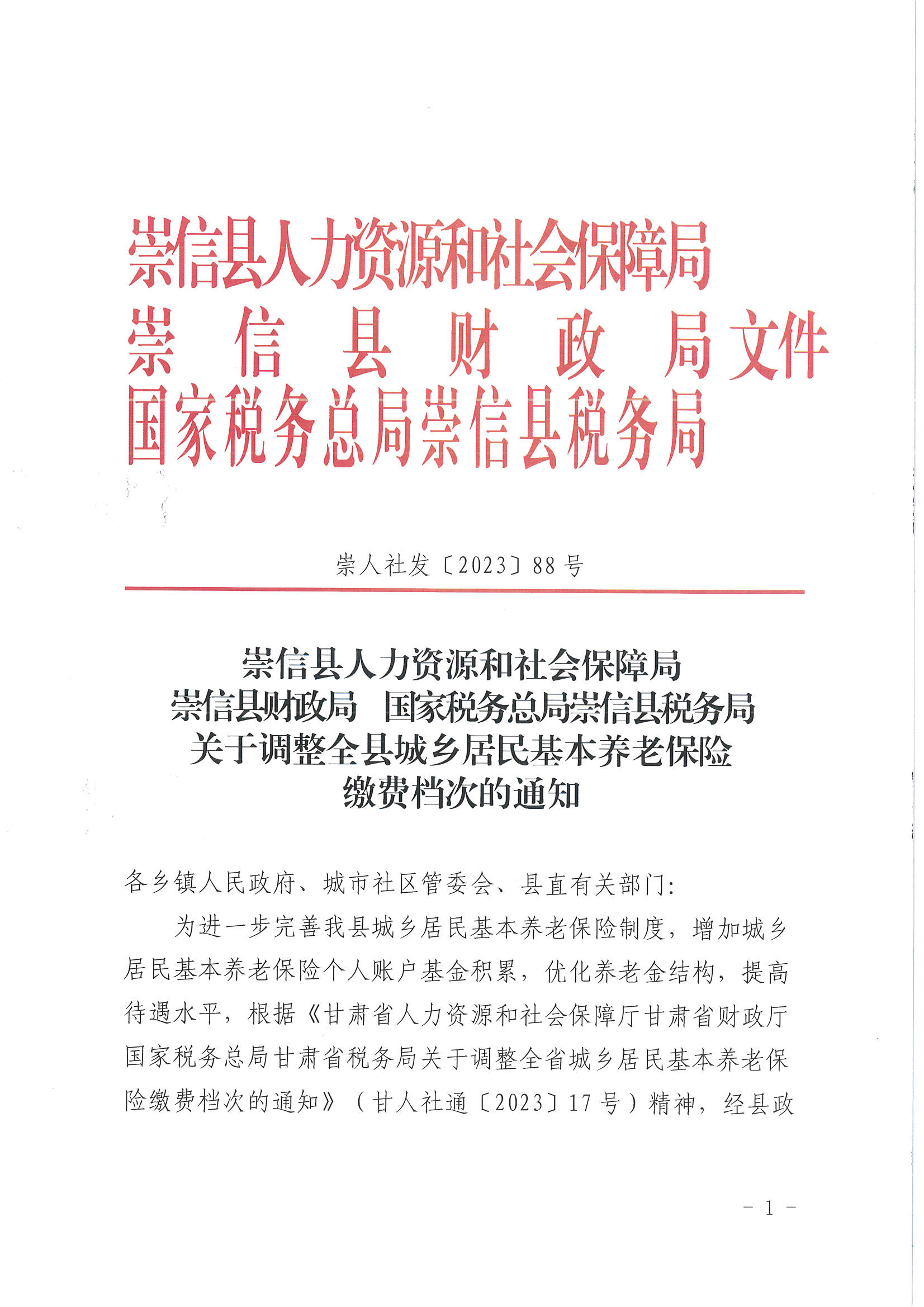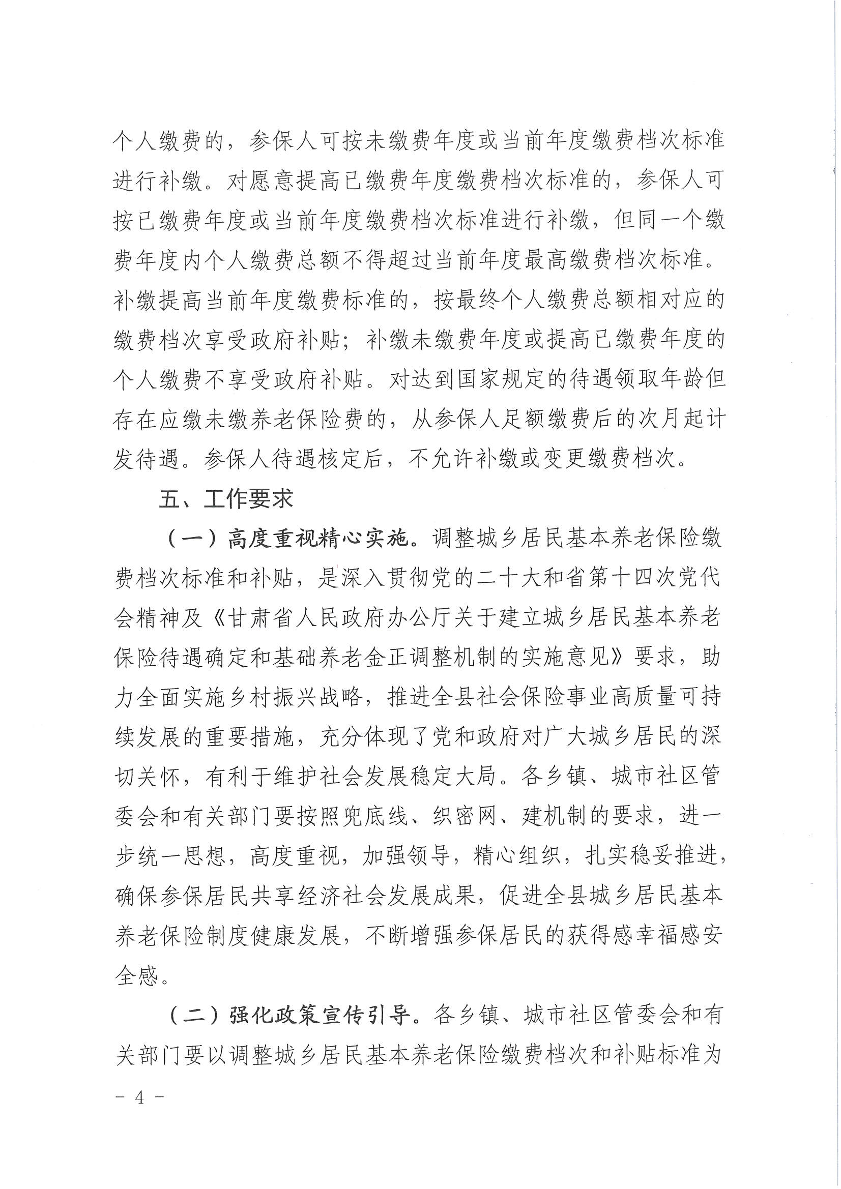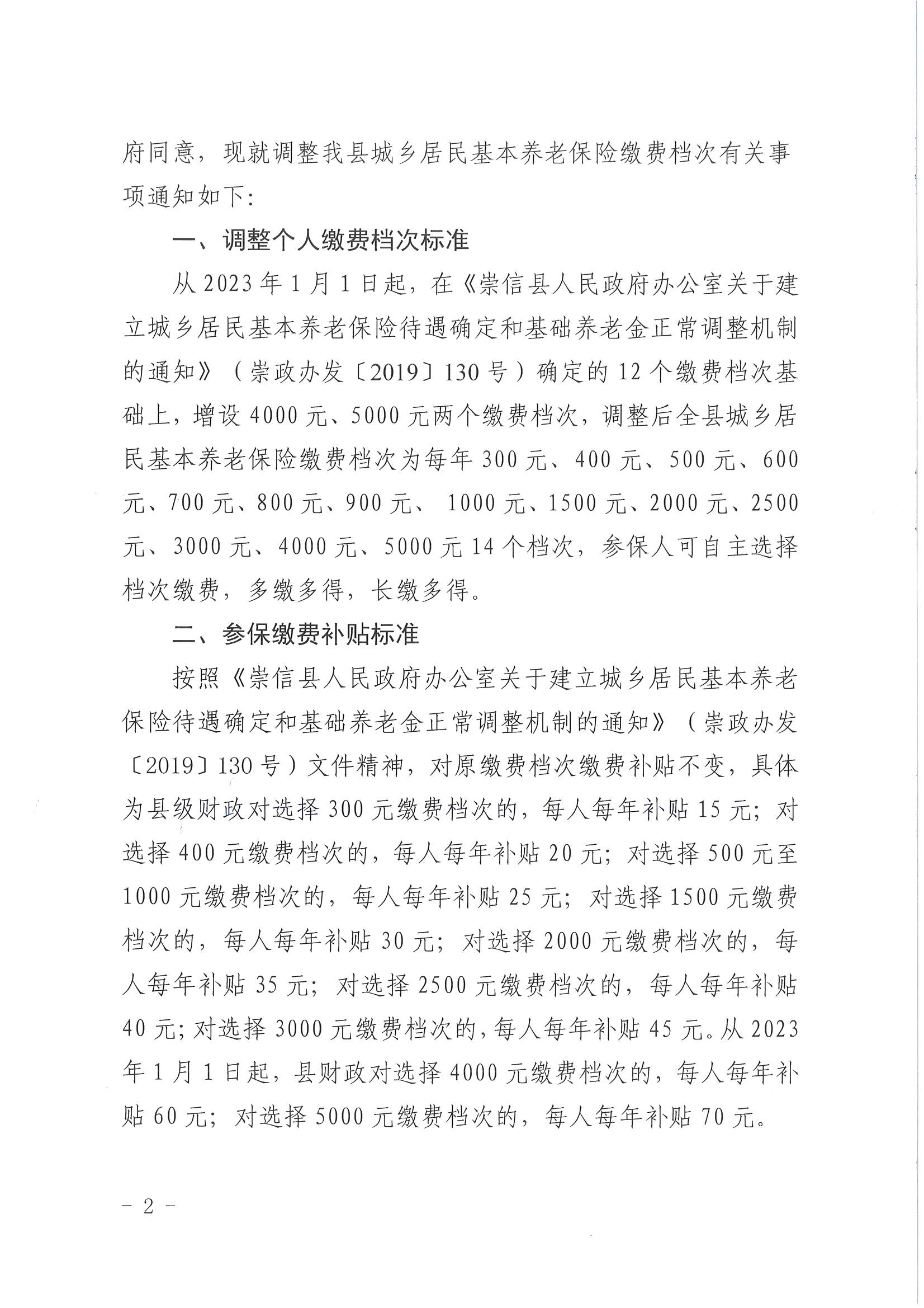 关于调整全县城乡居民基本养老保险缴费档次的通知[ 1 ] 发文日期:2023-04-01 12:30 来源:崇信县锦屏镇 作者:秦雅芸 编辑:秦雅芸 扫一扫在手机打开当前页 上一篇: 关于提高2023年城乡低保和特困人员救助供养标准工作的通知 下一篇: 锦屏镇:信访包案解难题 群众满意办实事