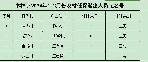 根据《崇信县最低生活保障审核确认实施细则》规定,木林乡人民政府对2024年1-3月份农村低保动态调整情况予以公示,公示接受各方监督,如有异议和不实情况,请及时向木林乡人民政府反映,我们将及时受理并调查处理。