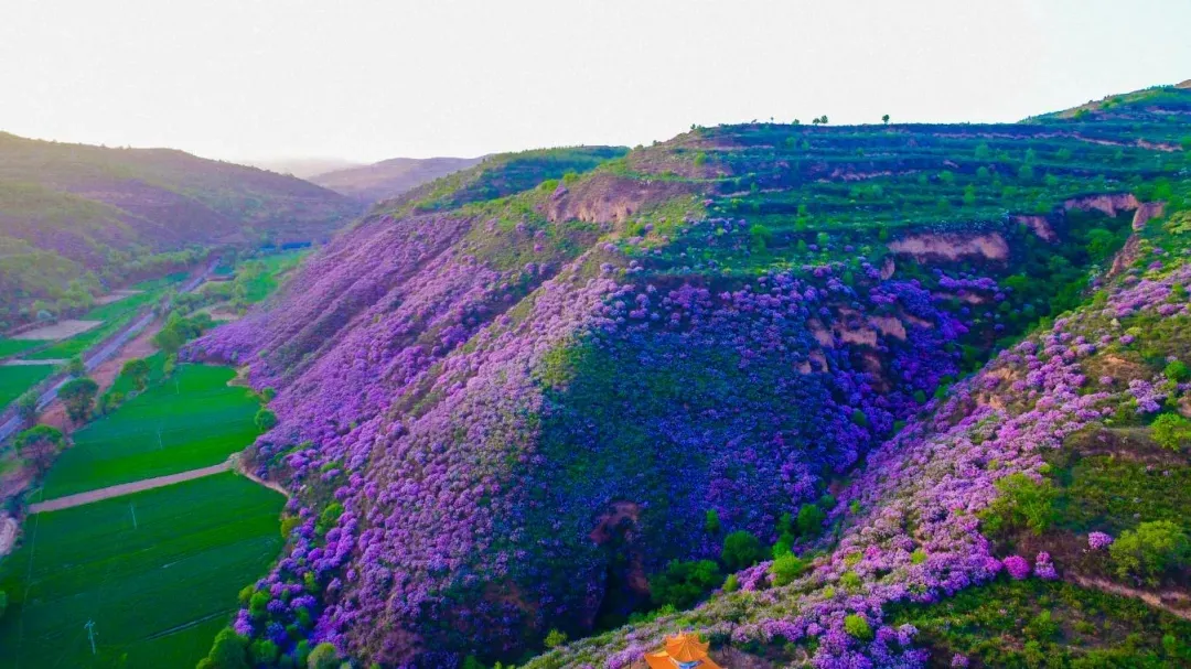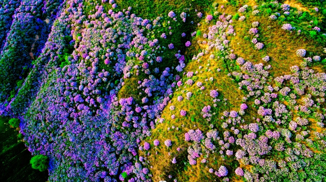 站在赤城村集中赏花点,极目远望,崇大路沿线的山坡上,成片的野生紫丁香花竞相争艳,与其他绿色植物互生共长,满眼的姹紫嫣红从山脚一直蔓延到山顶,紫丁香由疏到密,花团锦簇,肆意开放,如云如霞。村落、梯田与野生丁香花相映成趣,看到如此春色美景,你也定会笑嫣如花。