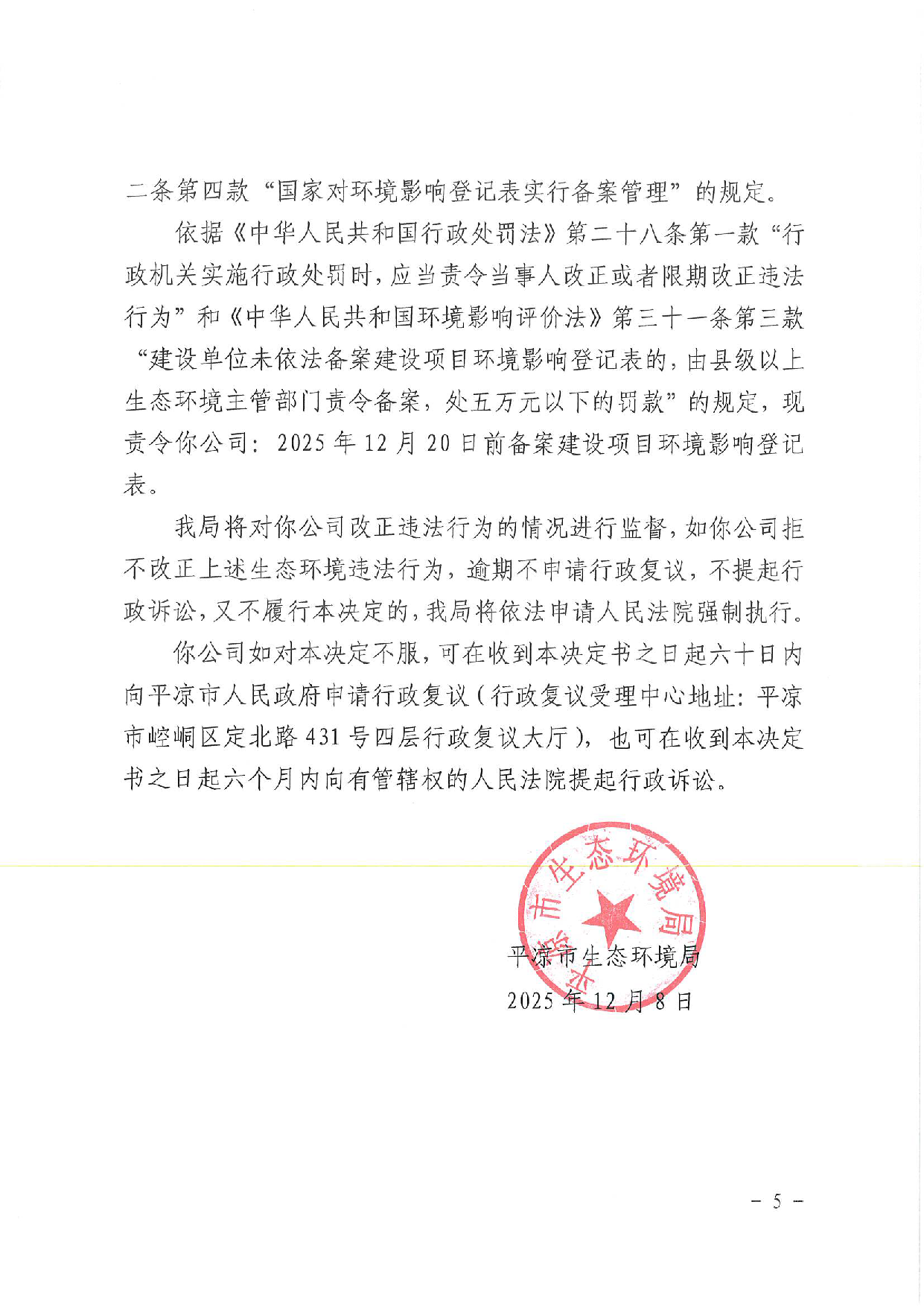 平环责改〔2025〕102号 发文日期:2025-12-09 11:37 来源:平凉市生态环境局崇信分局 作者:白斌 编辑:白斌 扫一扫在手机打开当前页 上一篇: 平凉市生态环境局崇信分局2026年1月份“双随机、一公开”监管抽查结果公示 下一篇: 平环责改〔2025〕100号
