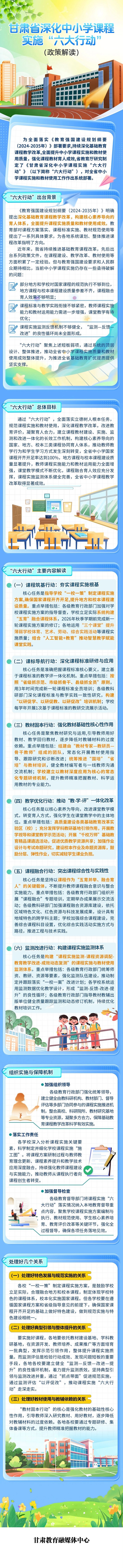 为全面落实《教育强国建设规划纲要(2024-2035年)》部署要求,持续深化基础教育课程教学改革,全面提升中小学课程实施质量与育人成效,省教育厅研究制定了《甘肃省深化中小学课程实施“六大行动”》,对全省中小学课程实施和教材使用工作作出系统部署。
