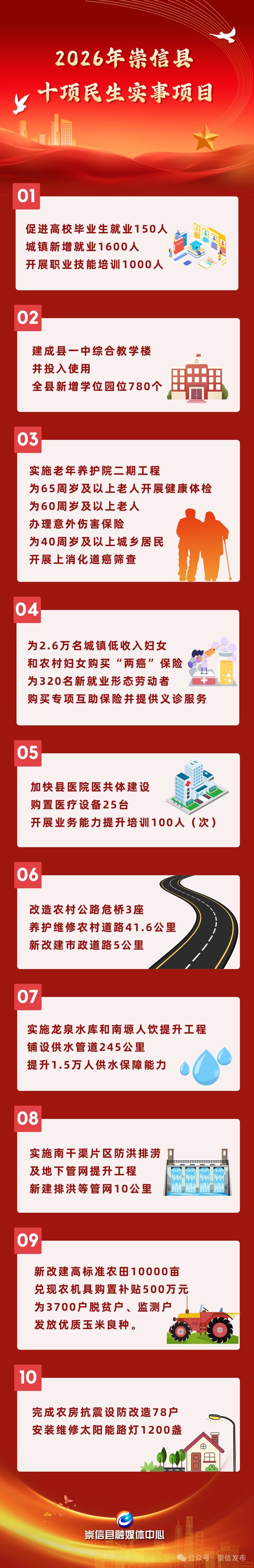 一图读懂||《崇信县2026年县列为民实事实施方案》 发文日期:2026-02-02 09:00 来源:崇信县融媒体中心 作者:崇信县融媒体中心 编辑:梁丽菲 相关链接:崇信县人民政府办公室关于印发2026年县列为民实事实施方案的通知 扫一扫在手机打开当前页 上一篇: 文字解读 ‖《崇信县农村人居环境整治以奖代补管理办法》政策解读 下一篇: 一图读懂 ||县政府第九十一次常务会议